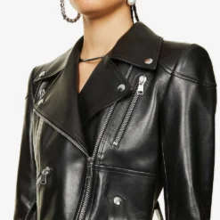 - Fitted, collar, long sleeves, panelled construction, silver-toned hardware, zip fastenings at cuffs, two zipped pockets at chest, zipped pocket at side, two popper-fastened straps at front and back, cropped at front, flared pleated hem at back, fully lined