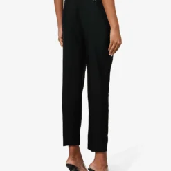 - Regular fit. mid-rise, tapered leg, structured waistband, sliced cut-outs at front, darts at back, buttoned welt pocket at back, pressed centre creases