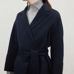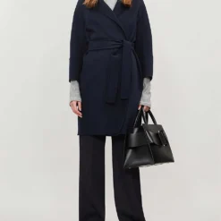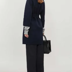- Peak lapels, long sleeves, two welt pockets at sides, belt loops, self-tie belt at waist, curved hem