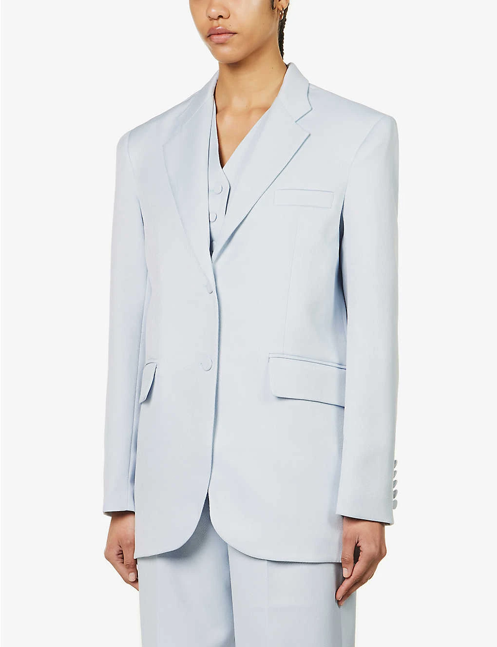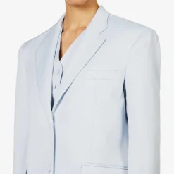 - Regular-fit, V-neck, notched lapels, long sleeves, five non-functioning buttons at cuffs, welt pocket at chest, darts at front, two flap pockets at front, all-over twill texture, single-vent at back, fully lined