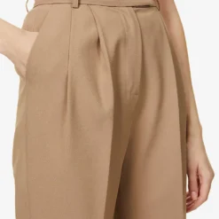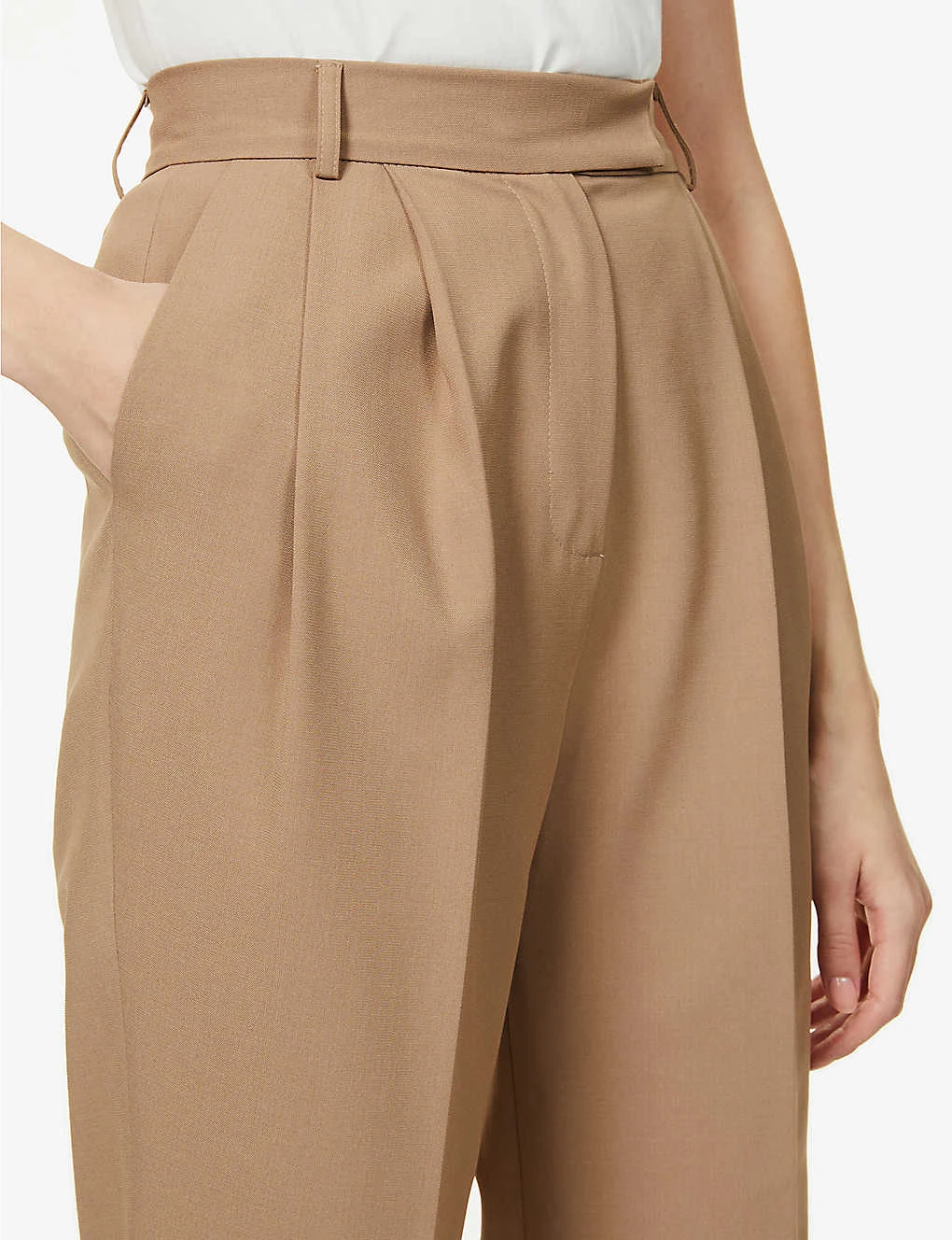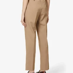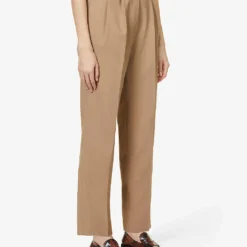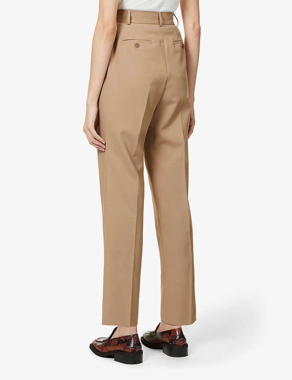 - Relaxed-fit, high-rise, tapered leg, structured waistband, belt loops, two slip pockets at front, pressed centre creases at front and back, darts at back, two buttoned jet pockets at back, partially lined