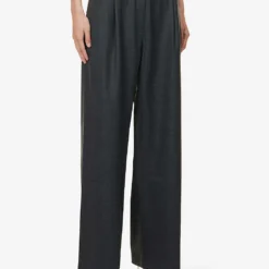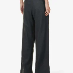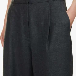 - Regular fit, mid-rise, wide leg, structured waistband with belt loops, two slip pockets at front, pleats at front, darts at back, two welt pockets at back