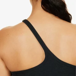 - Fitted, asymmetrical one shoulder neckline, sleeveless, self-shelf bra, cropped, straight hem