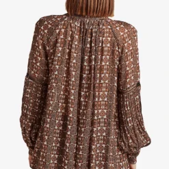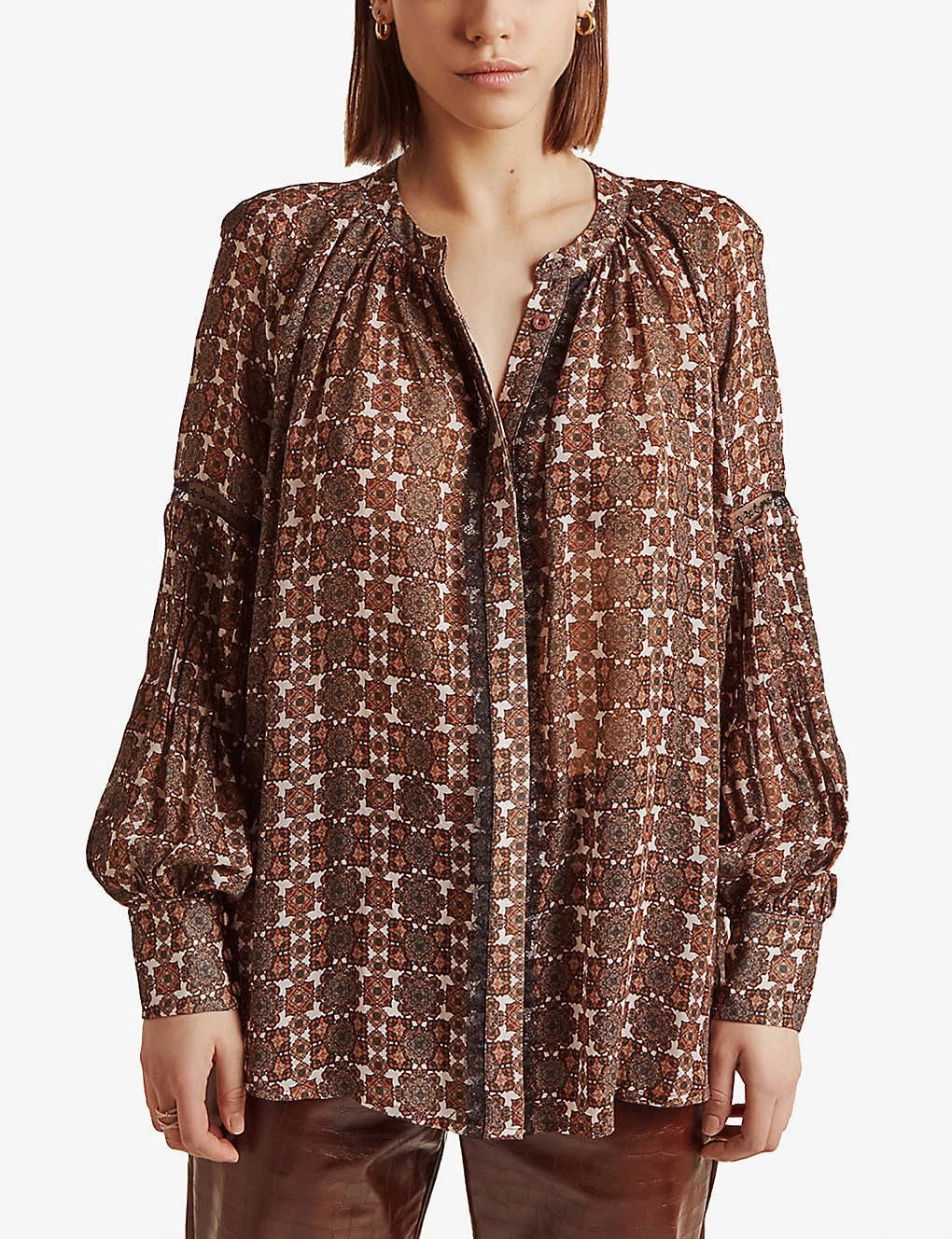 - All-over print, balloon sleeves, V-neckline, button front, draped silhouette