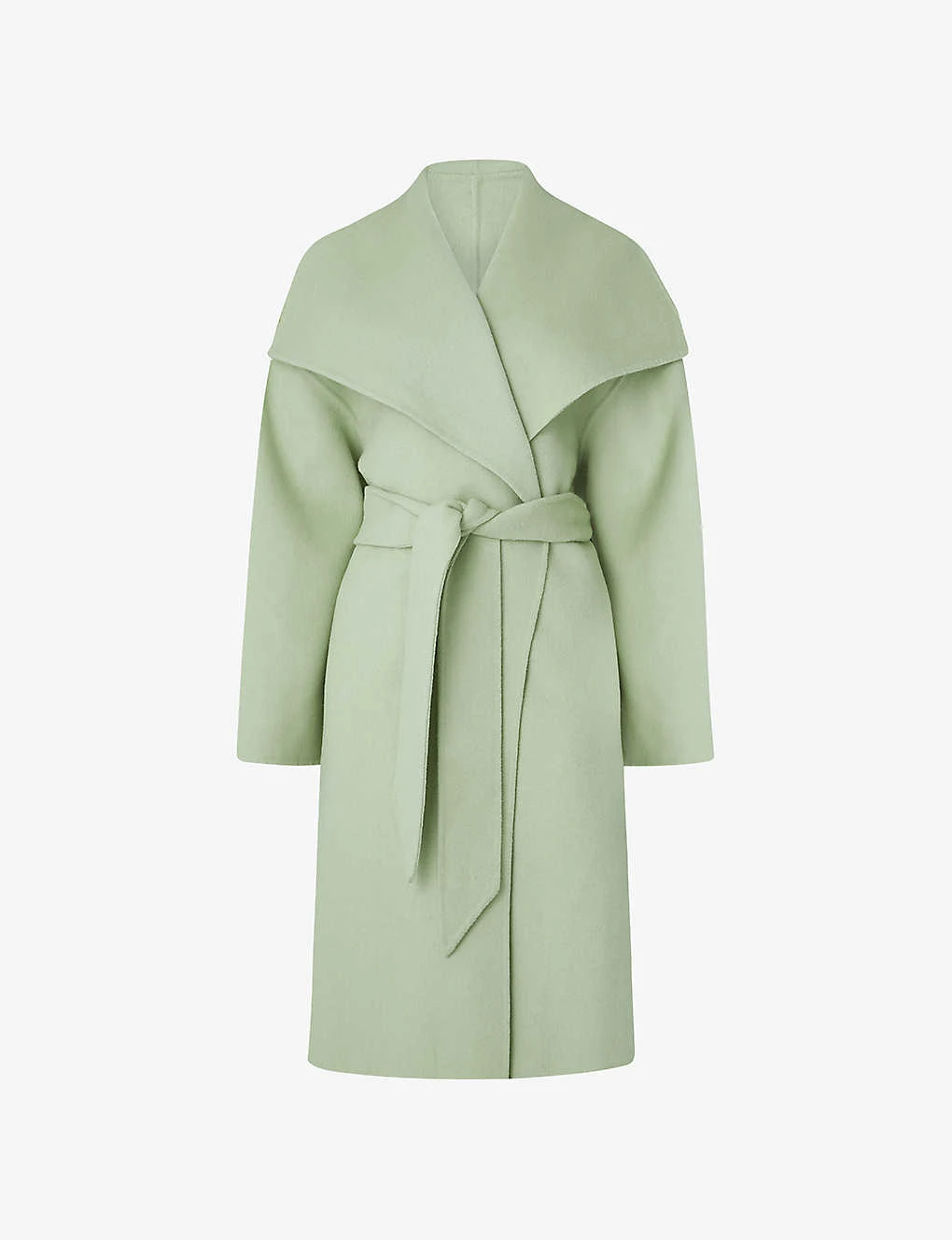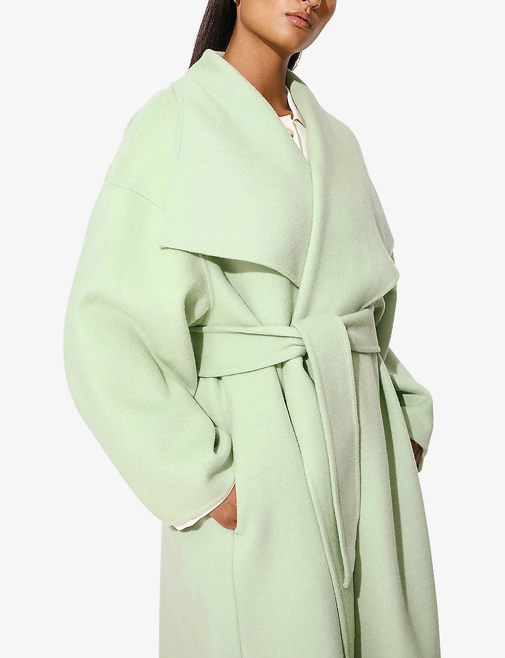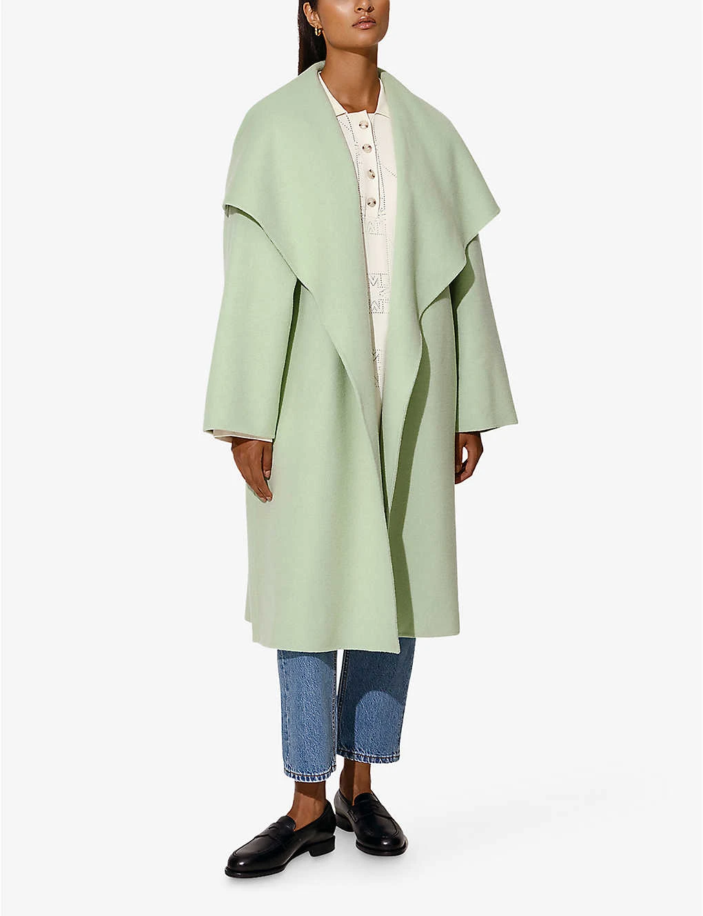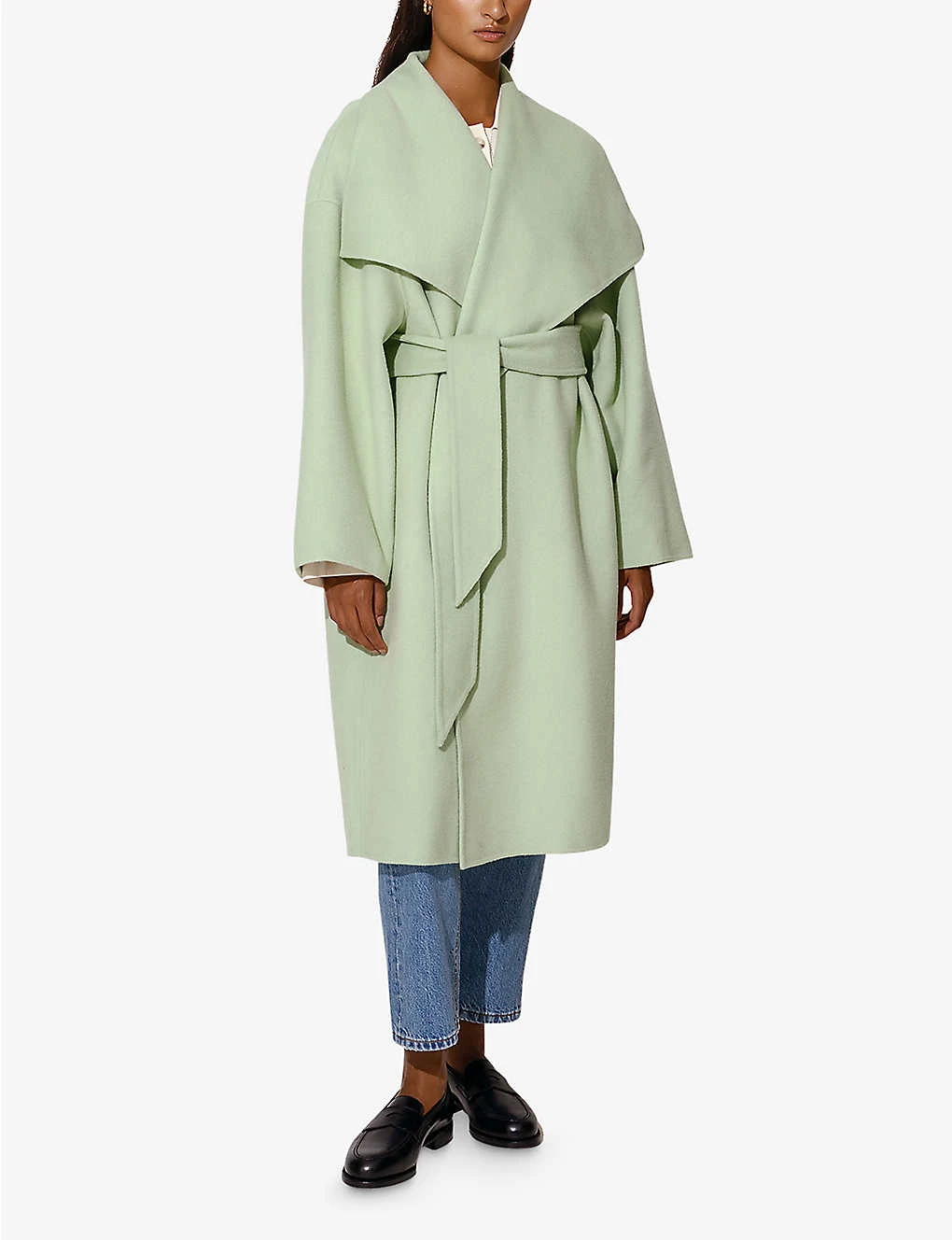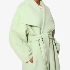 - Oversized fit, shawl collar, dropped shoulders, adjustable waist belt, wrap design, tonal topstitching