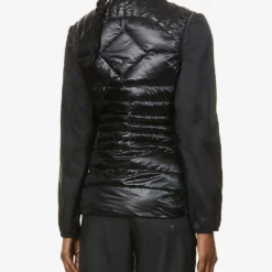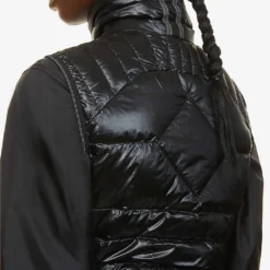 - Fitted, funnel neck, sleeveless, signature brand patch at chest, all-over quilted, slip pockets at sides, contrast woven panels at sides, fully padded and lined