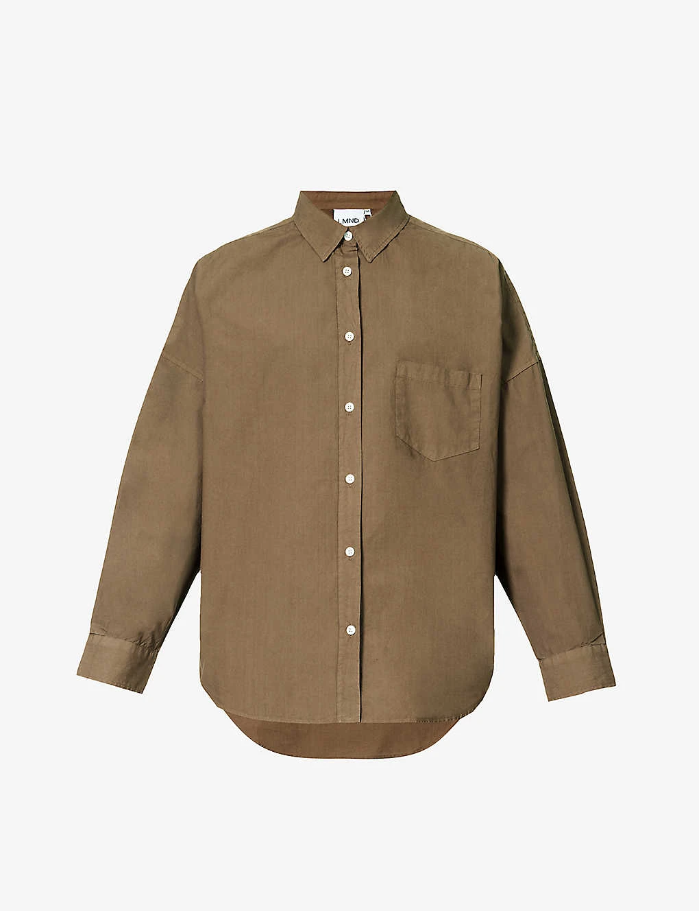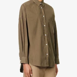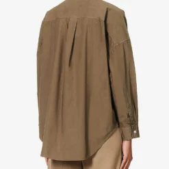 - Relaxed fit, collar, dropped shoulders, long sleeves, buttoned sleeve hems, patch pocket at chest, box pleat at back, pearlescent buttons, dipped hem at back