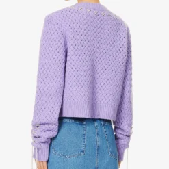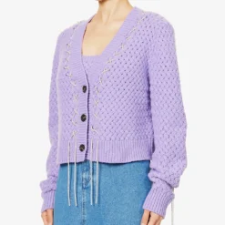- Cardigan: relaxed fit, cropped, V neck, long sleeves, elasticated cuffs, crystal straps embellishment at front, all over knitted, ribbed trims, elasticated hem