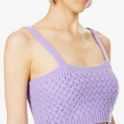 - Top: straight across neckline, cropped, shoulder straps, all over knitted, ribbed trims, elasticated hem