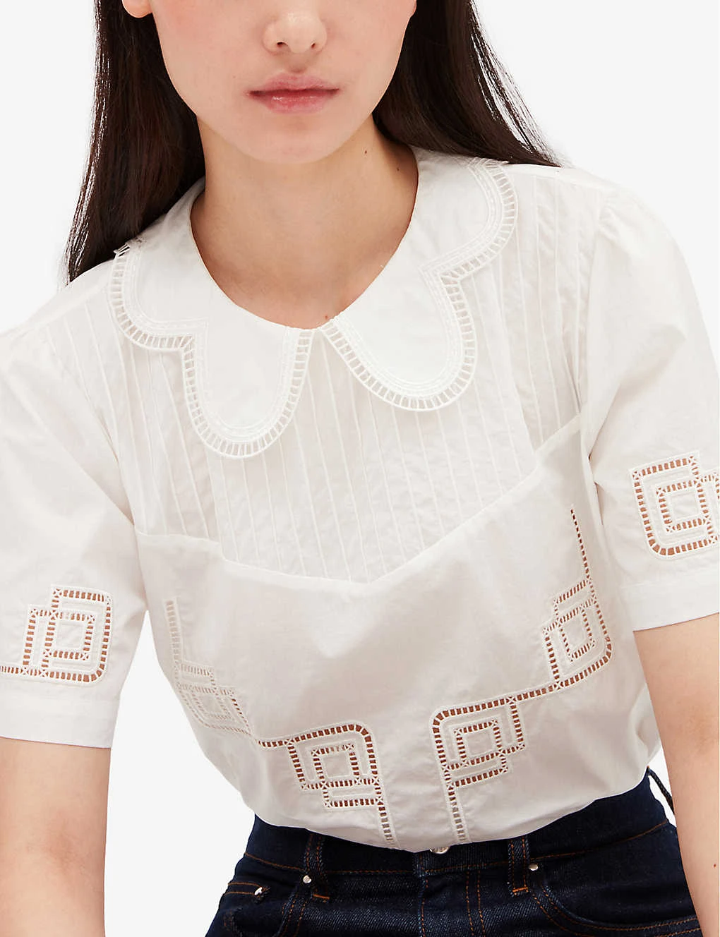 - Scalloped collar with openwork trim, pleated yoke, short sleeves, openwork lace details at sleeves and body