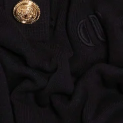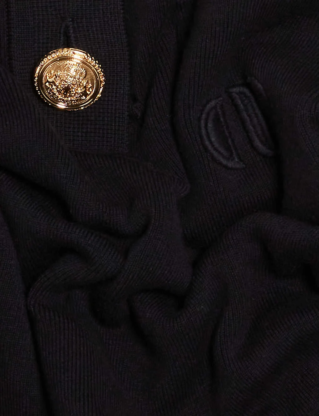 - Slim fit, long sleeves, spread collar, front top button placket, decorative gold-tone buttons, tonal logo embroidery at chest, chest patch pocket, straight hem