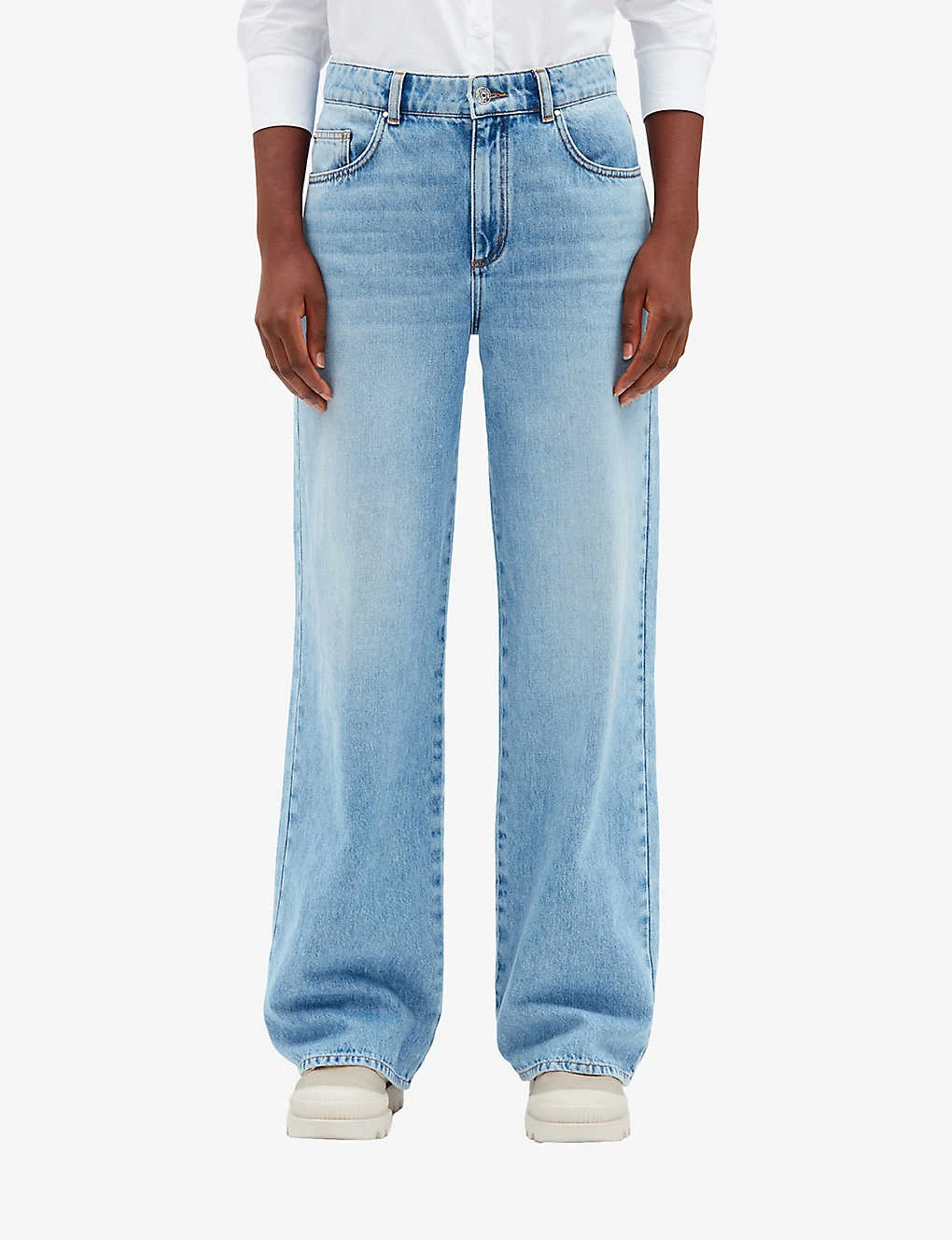 - Mid-rise, wide-leg, five-pocket detail, faded wash