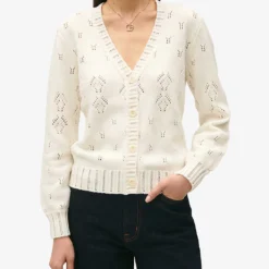 - Regular fit, V-neckline, ribbed trims, all-over pointelle embellishments, long sleeves, button up fastening at front