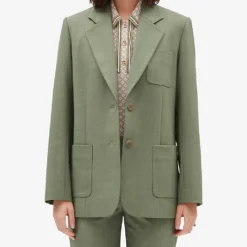 - Notched lapels, long sleeves, chest patch pocket, two patch pockets at front, buttoned cuffs, single vent at back, fully lined, single-breasted design