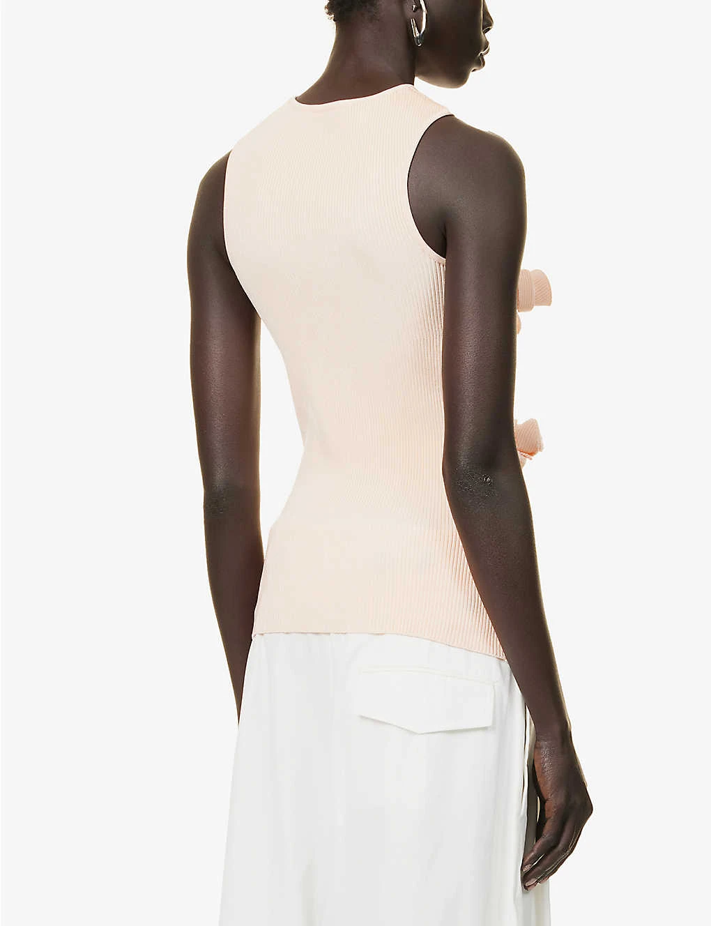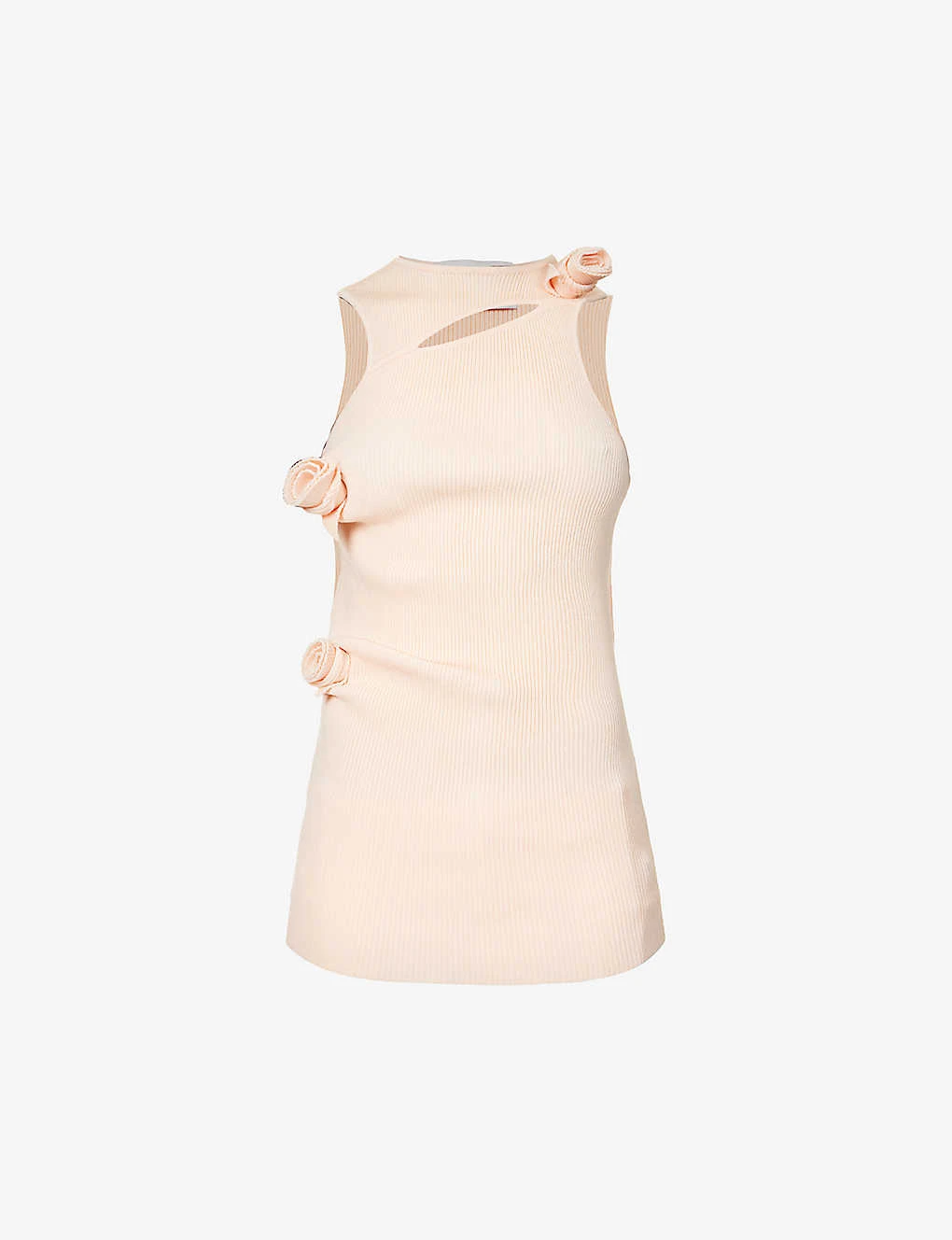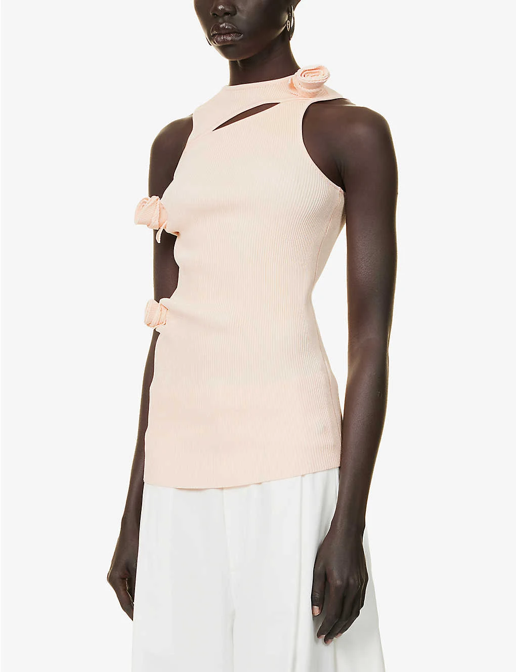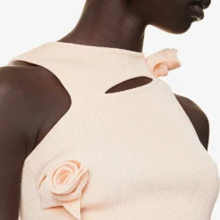 - Slim fit, round neck, sleeveless, slash cut-out at front, three dimensional rose at front, ruched pattern, ribbed knit texture