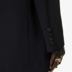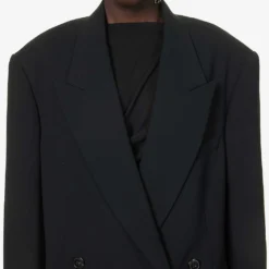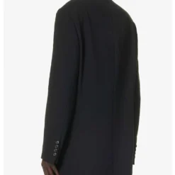 - Oversized fit, peak lapels, long sleeves, buttoned cuffs, welt pocket at chest, darts at front, two welt pockets at front, double breasted, lined