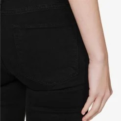 - Slim-fit, high-rise, flared leg, belt loops, branded gold-toned hardware, five pockets, wide V-shaped yoke at back, partially lined
