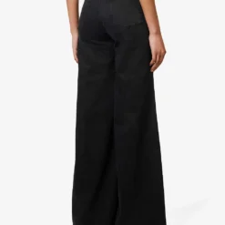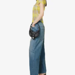 - Regular fit, high rise, wide leg, structured waistband with belt loops, five pockets, faded wash, branded hardware