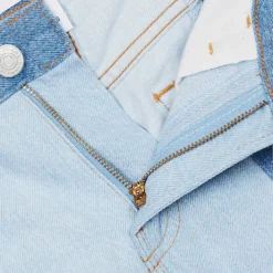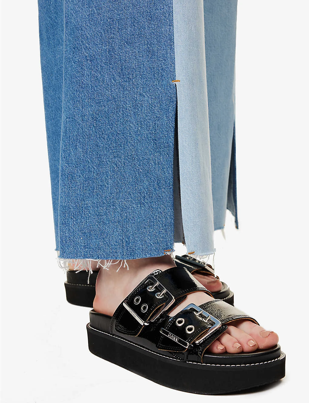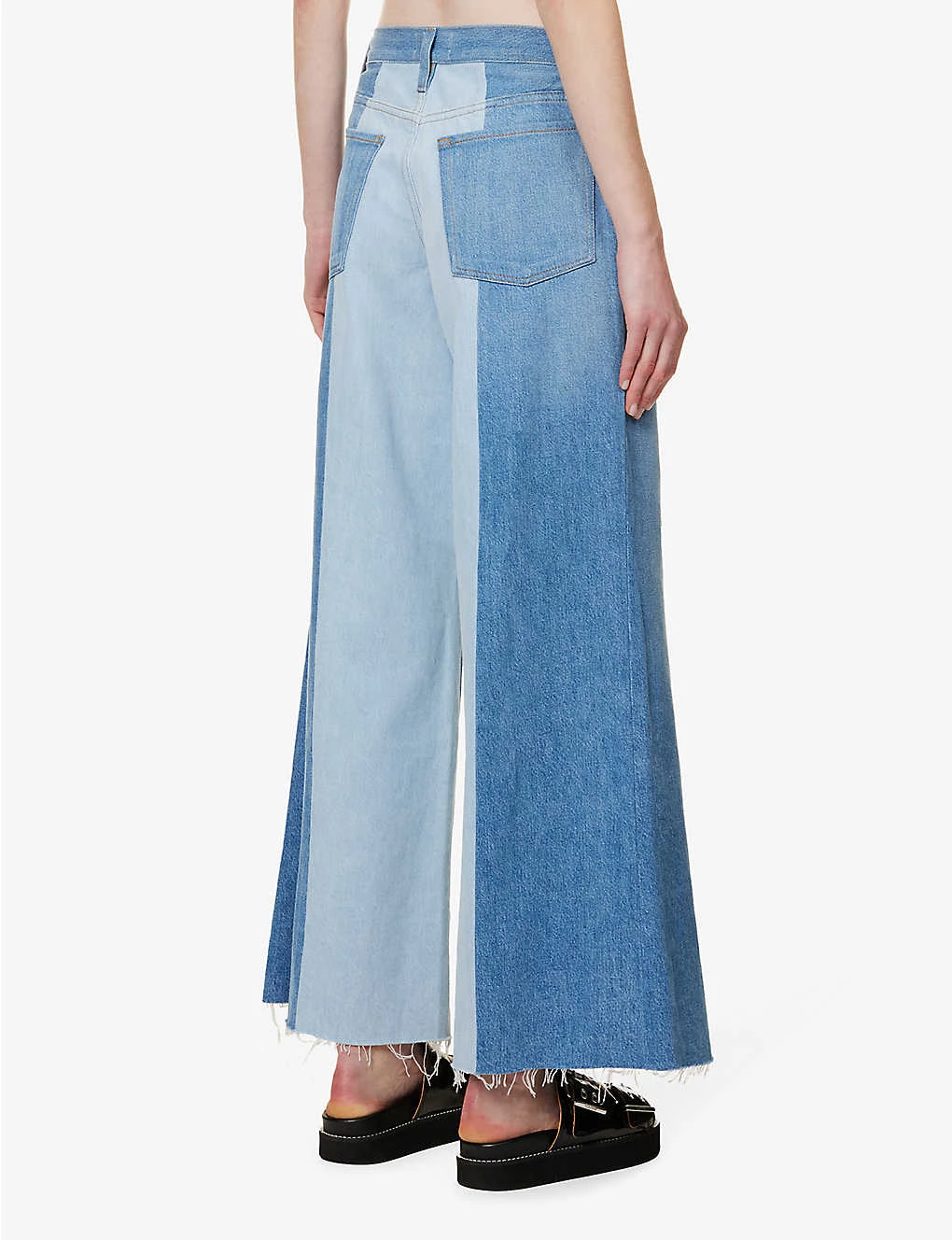 - Regular fit, mid-rise, wide leg, structured waistband with belt loops, five pockets, curved yoke at back, contrast stitching, panelled pattern, two-toned wash, split hems, raw trim at hem, branded silver-toned hardware