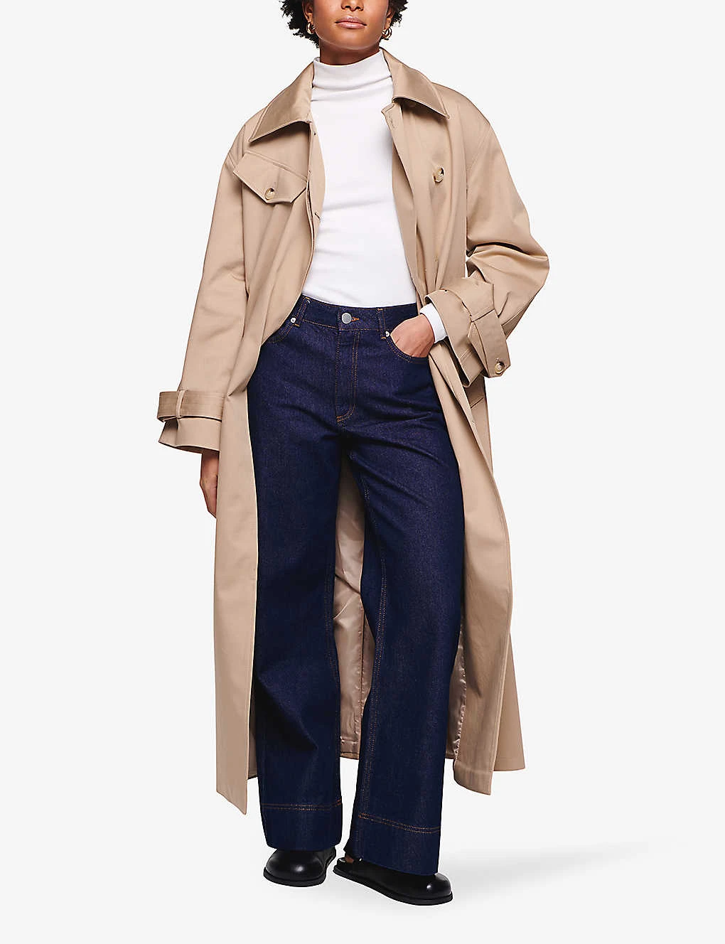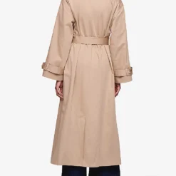 - Double-breasted, spread collar, contrast buttons, notch lapels, wide long sleeves, button cuffs, belt loops, detachable belt at waist, flap pockets at chest, midi length, fully lined