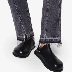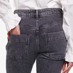 - Regular fit, slim leg, mid rise, split hem, five-pocket design, faded wash, gunmetal hardware