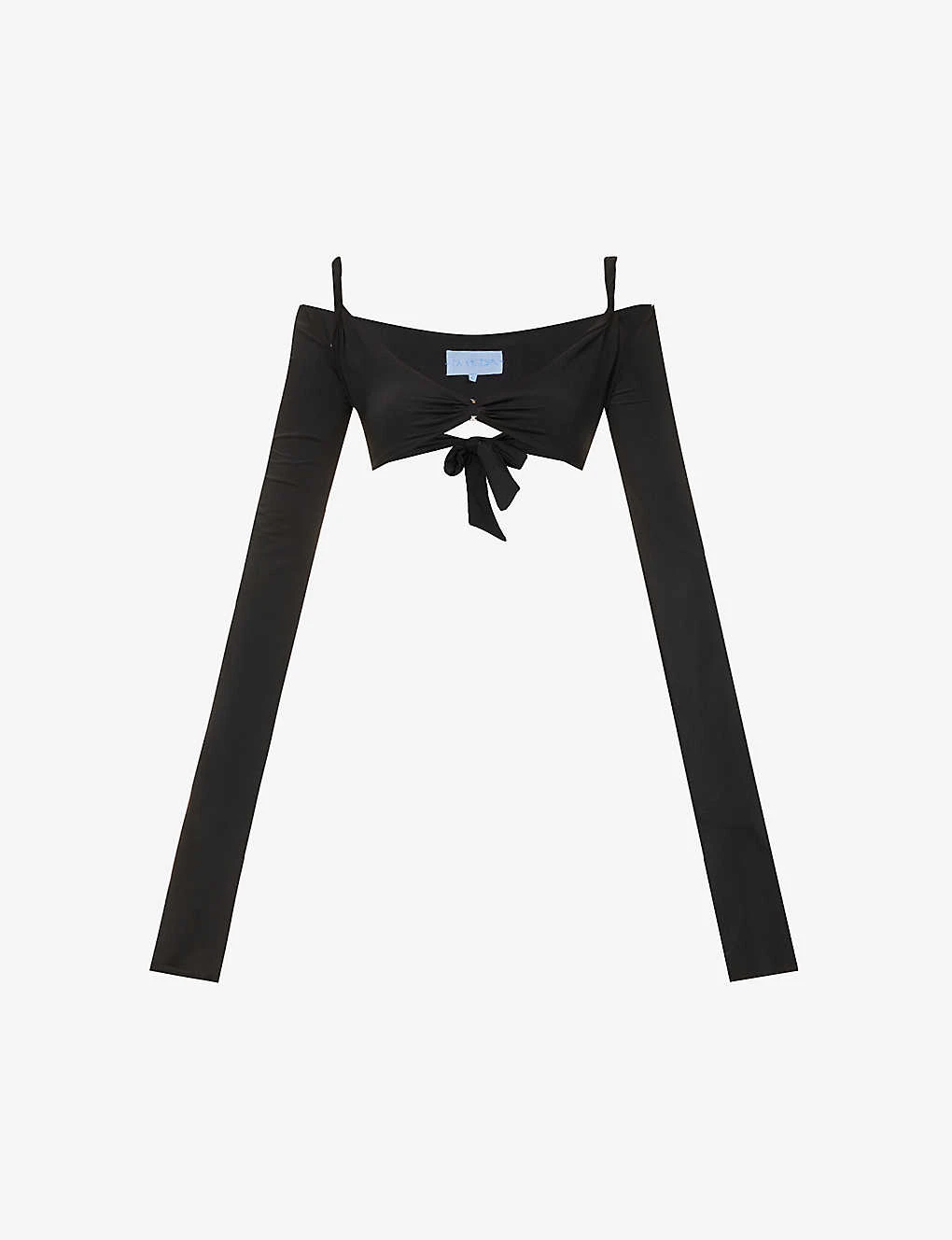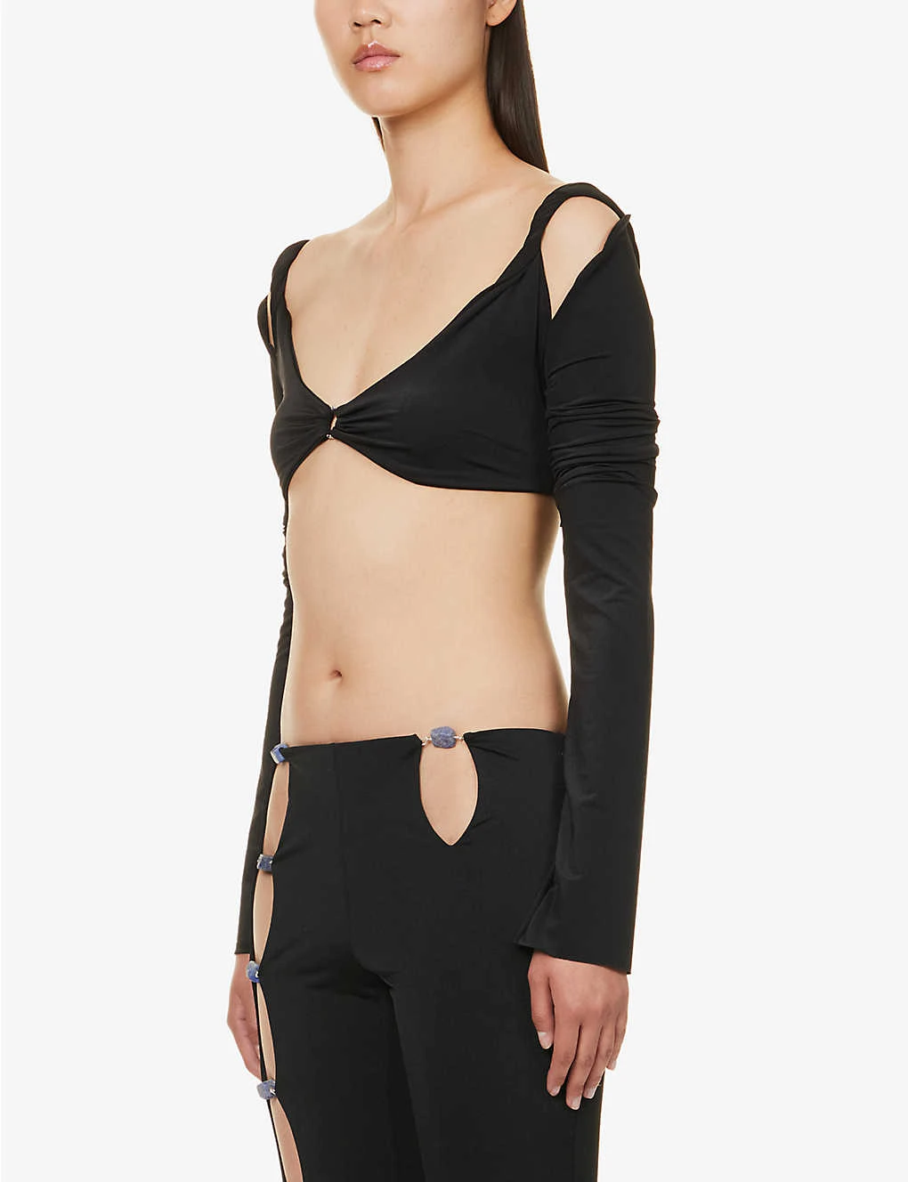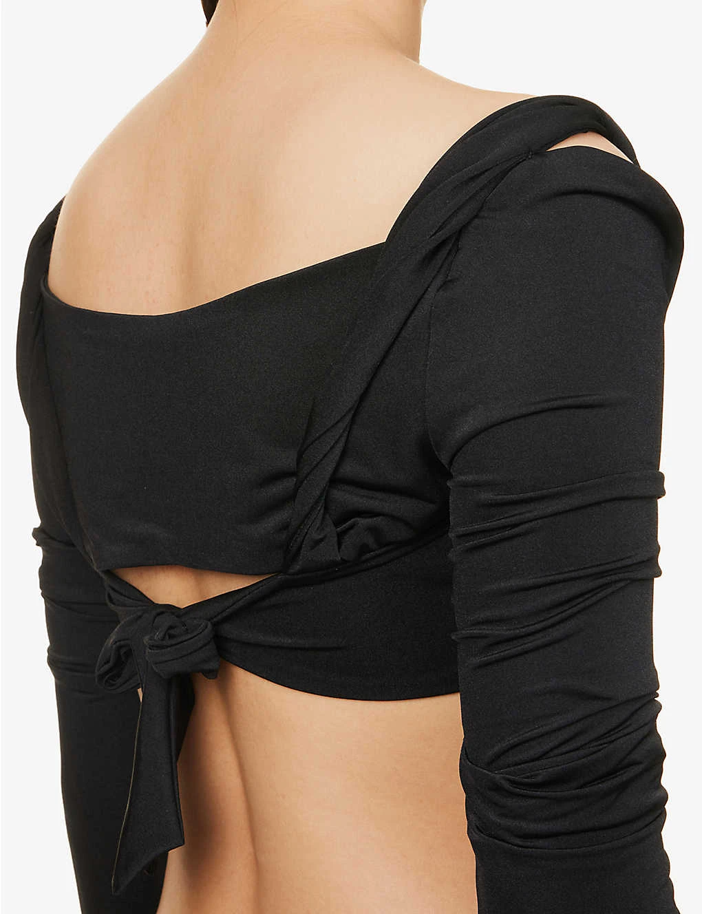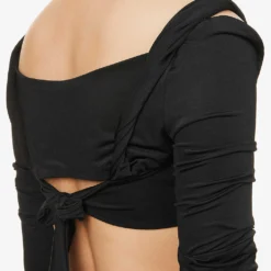 - Slim fit, sweetheart neckline, exposed shoulders, long sleeves, twist design at straps, silver-toned brand charm at front, cropped