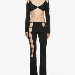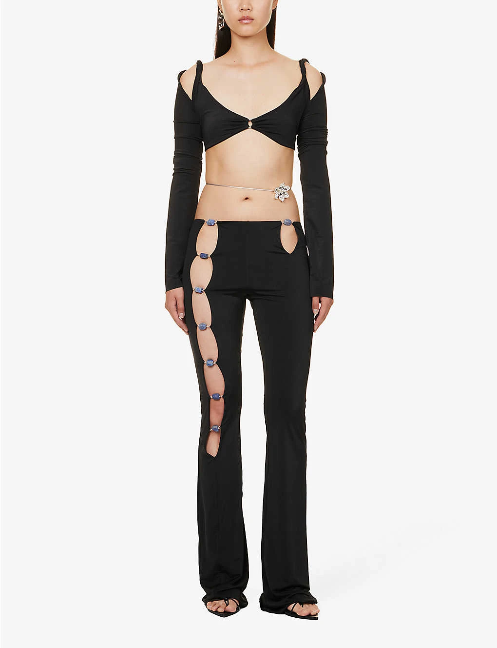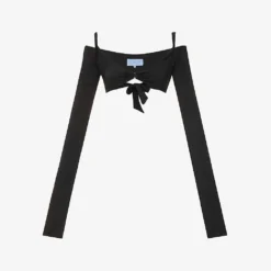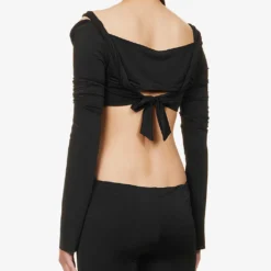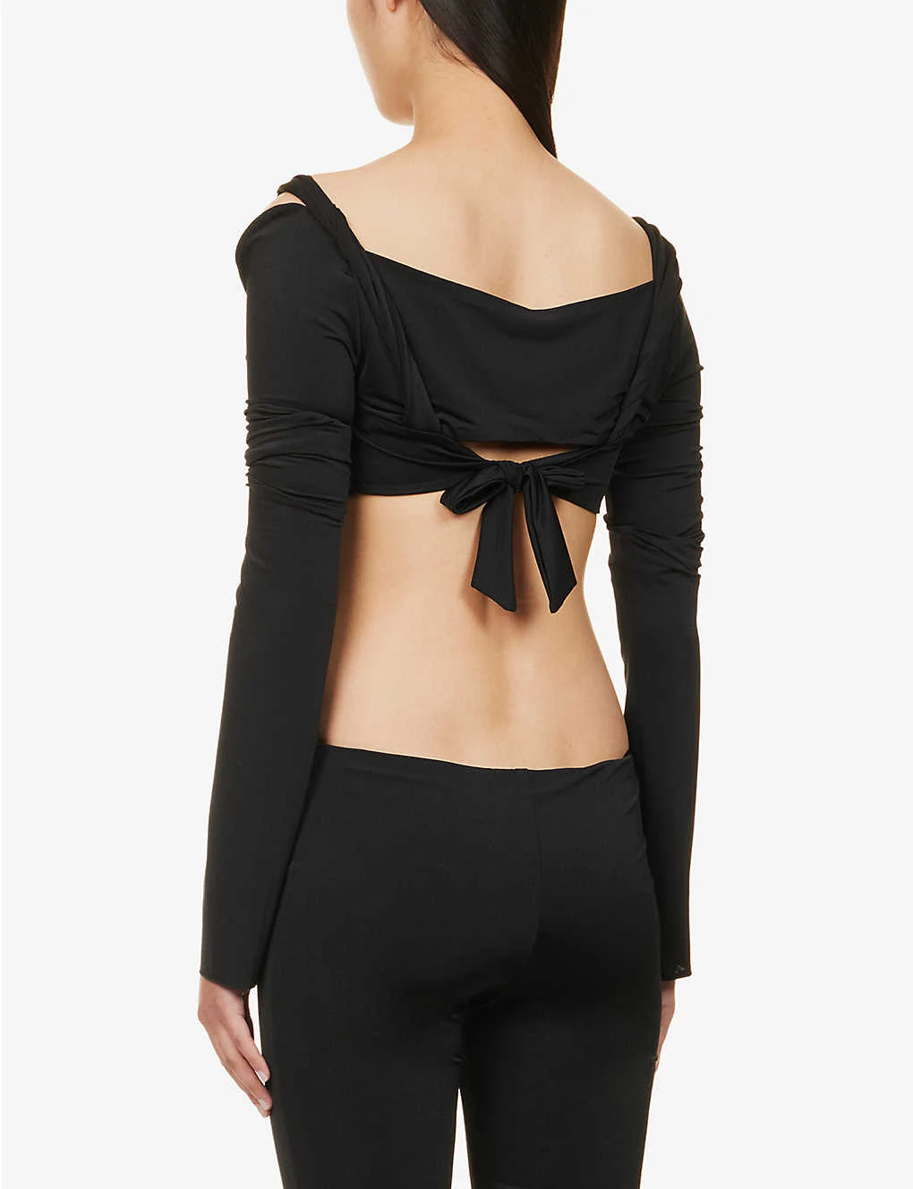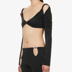- Slim fit, sweetheart neckline, exposed shoulders, long sleeves, twist design at straps, silver-toned brand charm at front, cropped