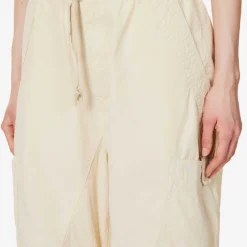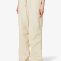 - Relaxed fit, dropped crotch, wide leg, elasticated drawstring waistband, two slip pockets at front, two hook-and-loop patch pockets at sides, buttoned flap pocket at back, drawstring hems