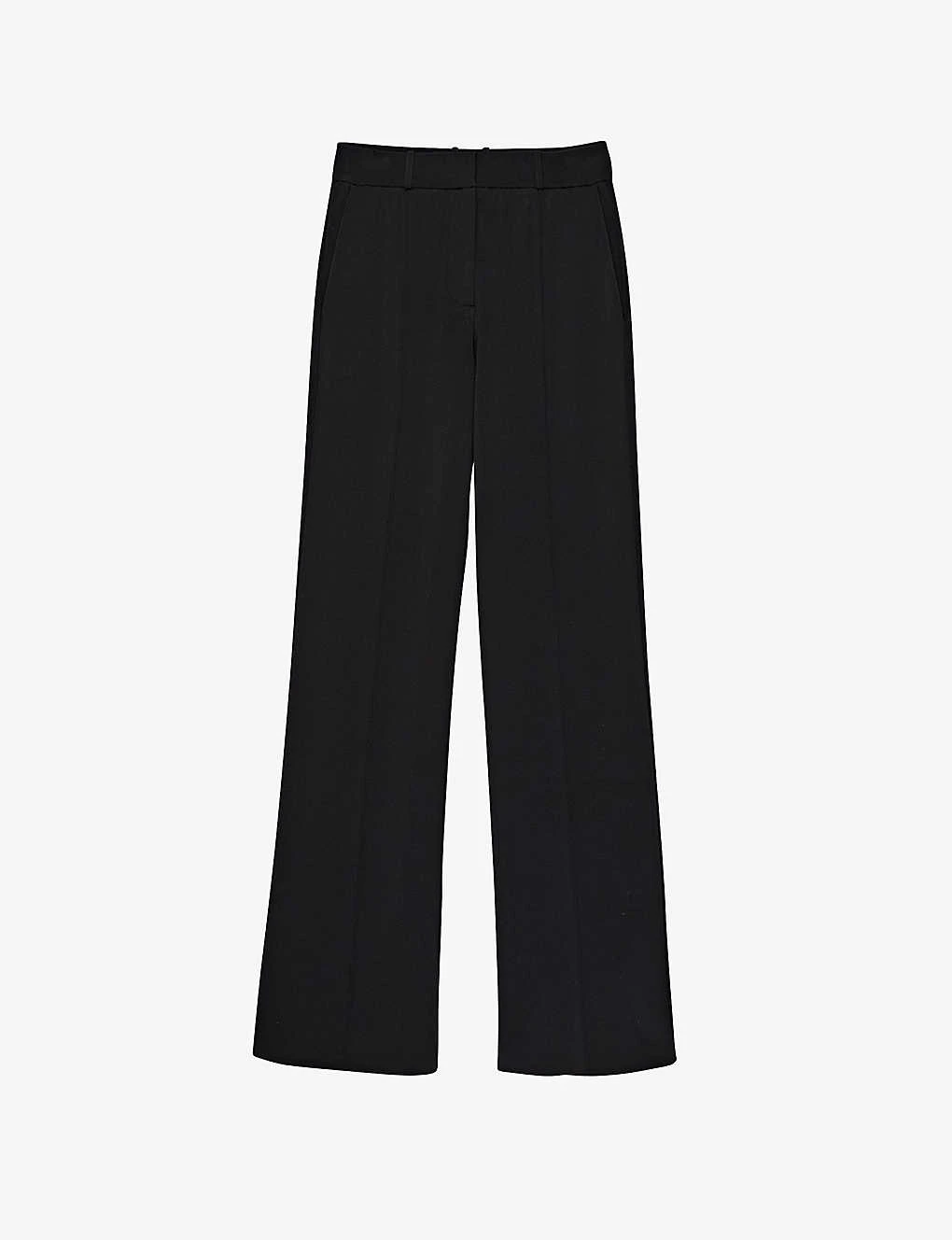 - Straight legs, slightly flared hems, mid-rise waist, side pockets, pressed creases