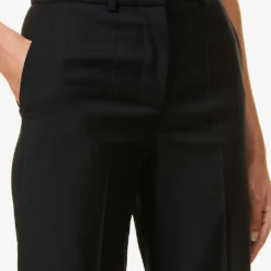 - Regular fit, high rise, wide leg, belt loops, two slip pockets at sides, pressed centre creases at front and back, two welt pockets at back