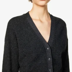 - Relaxed fit, V-neckline, dropped shoulders, long sleeves, branded pearlescent buttons, brushed texture, fine knit, ribbed hem