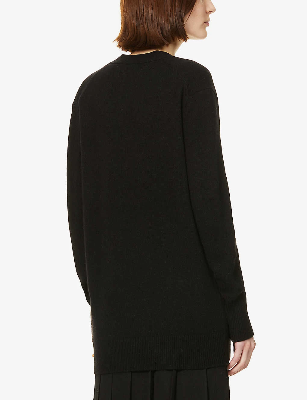 - Relaxed fit, V-neck, ribbed weave trims, elongated cuffs, stitch pattern at shoulders, branded buttons at chest