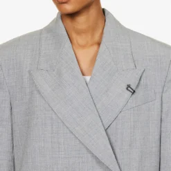 - Relaxed fit, double-breasted, peak lapels, padded shoulders, long sleeves, buttoned cuffs, welt pocket at chest, two flap pockets at front, vent at back, fully lined