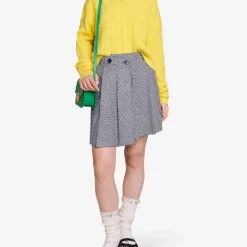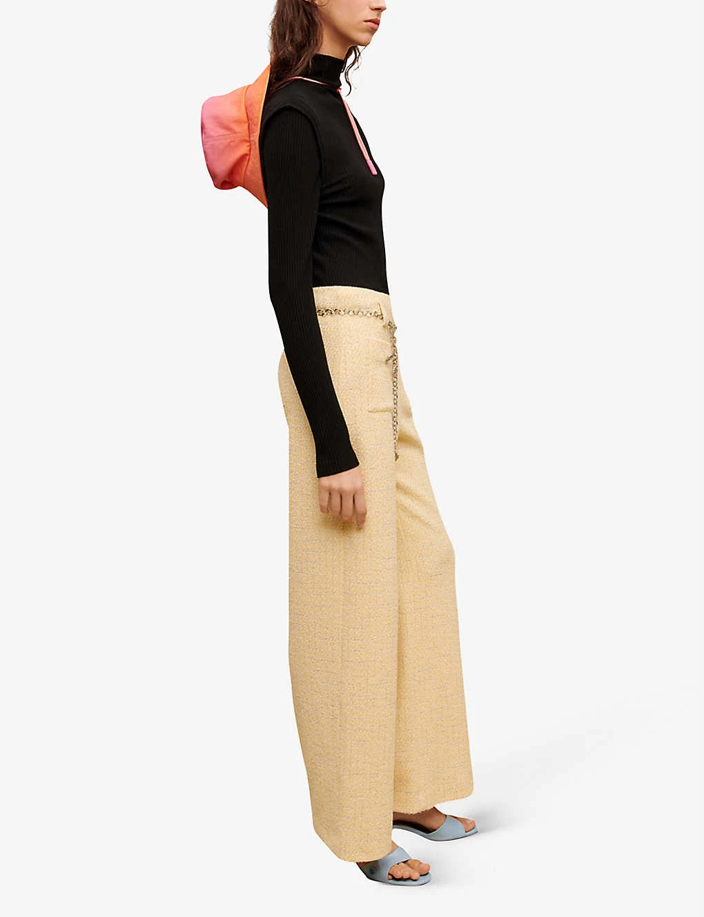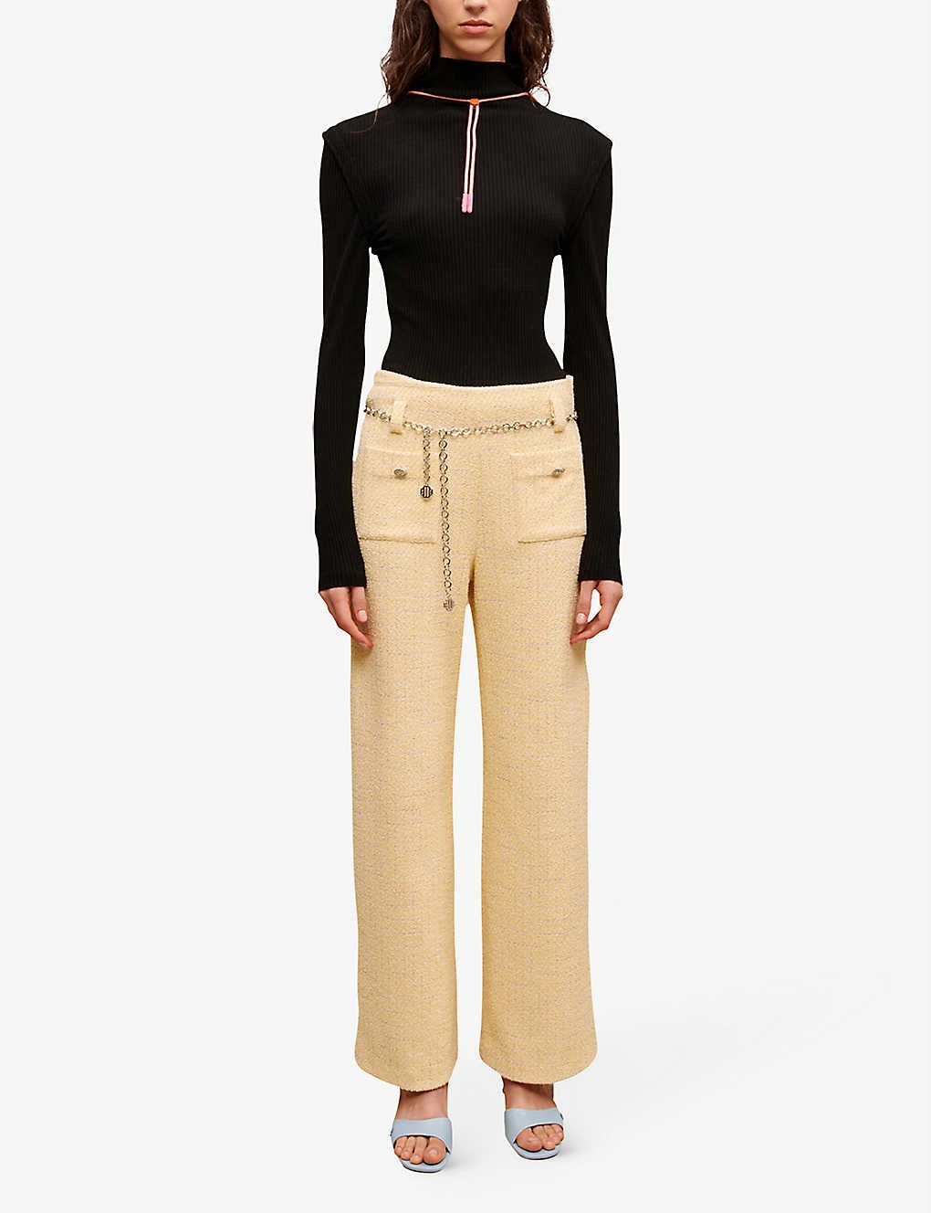 Loose-fit, mid-rise, wide-leg, belt loops, two patch pockets at front, all-over metallic-tweed texture, removable chain belt
