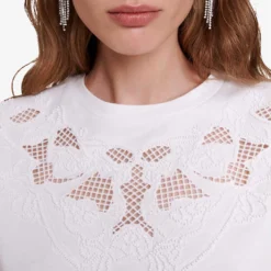 - Round neck, short sleeves, embroidered lace and beaded lace panel, straight hem