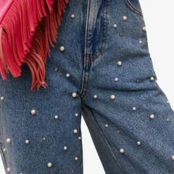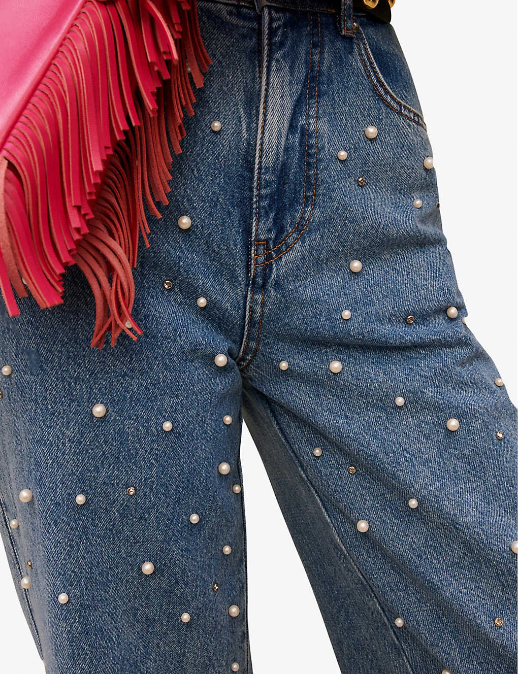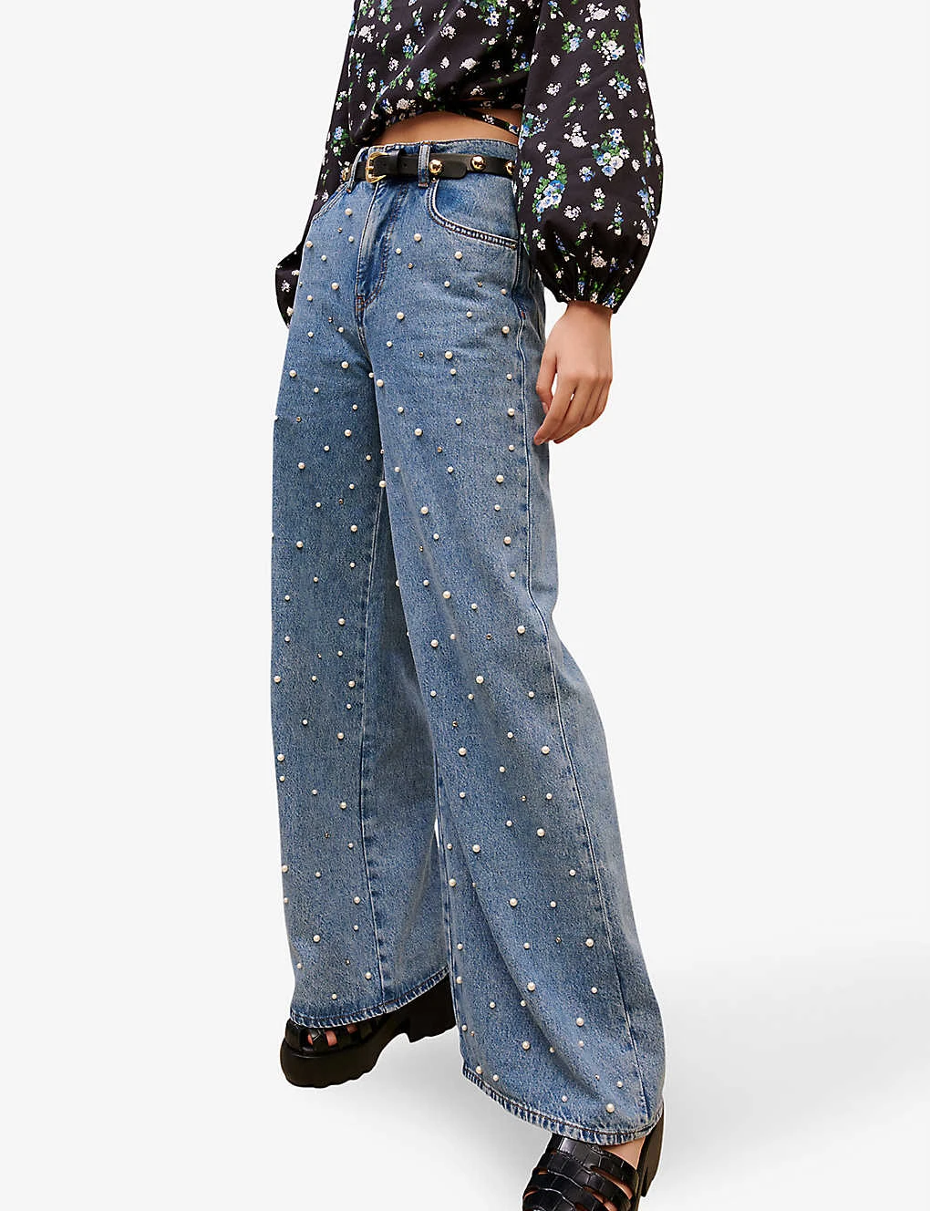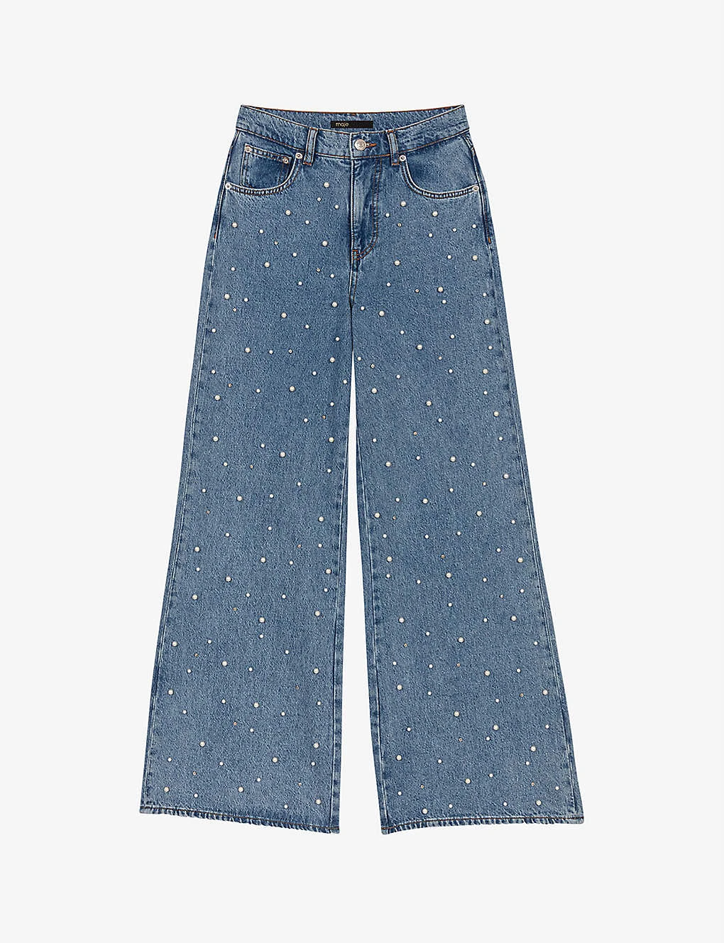 - Straight, wide-leg, high-rise, belt loops, five pockets, faded wash, all-over embellishment, silver-toned hardware