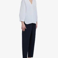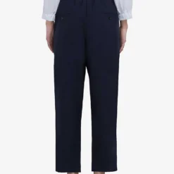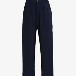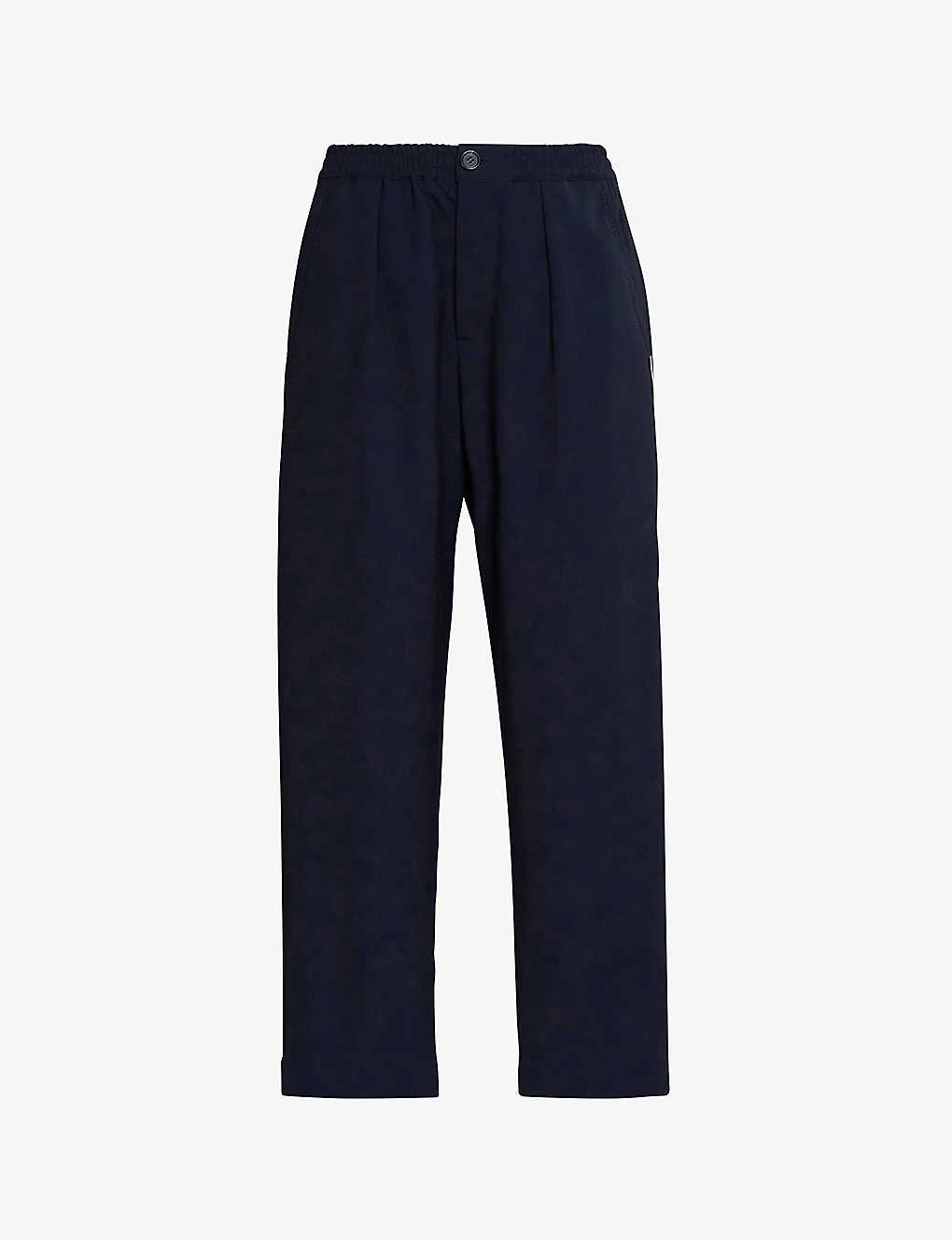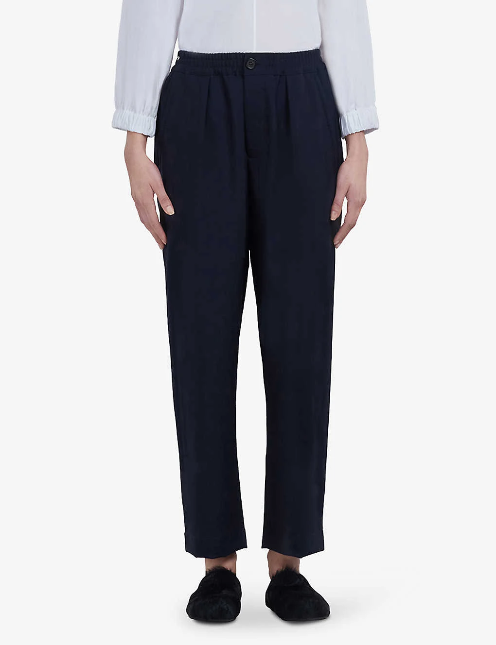 - Mid-rise, tapered-leg, elasticated waist, pleated front, front slip pockets