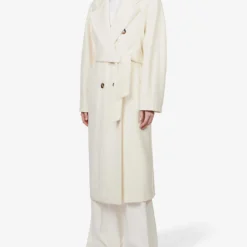 - Notch lapels, double-breasted, dropped shoulders, long sleeves, two slip pockets at front, relaxed-fit, self-tie belt at waist, all-over brushed texture, exposed centre seam at back, fully lined
