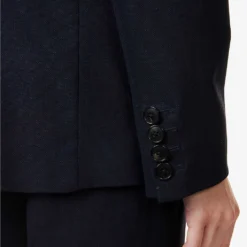 - Regular-fit, V-neck, peak lapels, double-breasted, long sleeves, four buttons at cuffs, welt pocket at chest, darts at front, two flap pockets at front, single-vent at back, fully lined