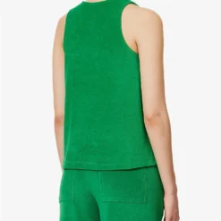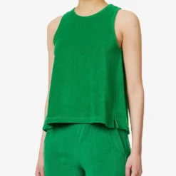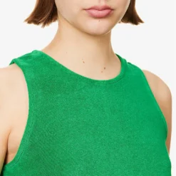 - Regular-fit, scoop neck, shoulder straps, all-over towelling texture, trapeze silhouette, notched hem