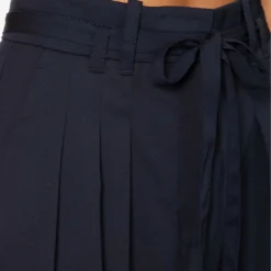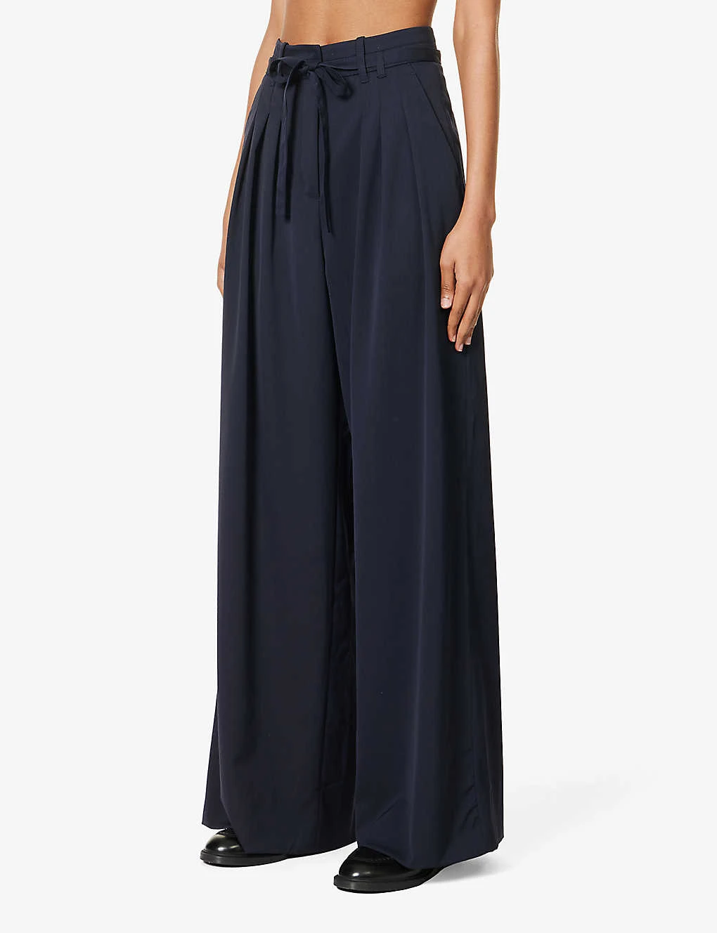- Relaxed fit, high rise, wide leg, belt loops, self-tie belt at waist, six knife pleats at front, two slip pockets at sides, darts at back, two buttoned welt pockets at back, partially lined