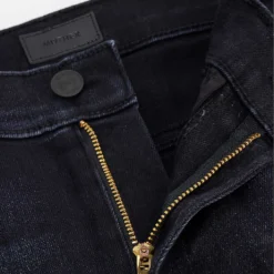 - Slim fit, mid-rise, straight leg, structured waistband, belt loops, five pockets, V-shaped yoke at back, brand tab at back, branded hardware, raw hems