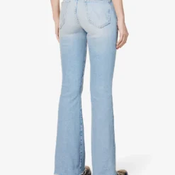 - Regular fit, mid-rise, flared leg, belt loops, five pockets, contrast stitching, faded wash and whiskering, brand tab at back waist, V-shaped yoke at back, frayed hem