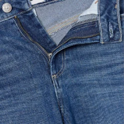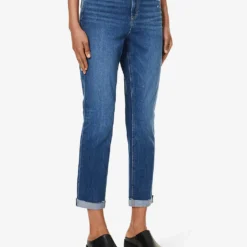 - Boyfriend fit, high rise, slim leg, five pockets, branded hardware, distressed and faded wash, brand patch at back, V-shaped yoke at back, partially lined, cropped, raw folded cuffs