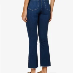 - Regular fit, high rise, flared leg, ankle grazer, five pockets, brand patch at back, curved yoke at back, contrast stitching, mid-wash, branded silver-toned hardware, raw hems