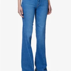 - Regular fit, high rise, flared leg, structured waistband with belt loops, five pockets, brand patch at back, contrast stitching, branded silver-toned hardware