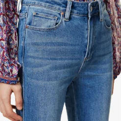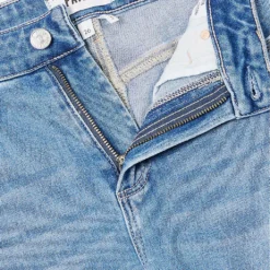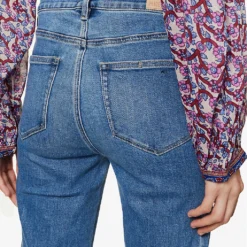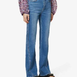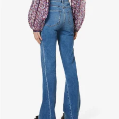 - Regular fit, high rise, bootcut leg, structured waistband with belt loops, five pockets, brand patch at back, curved yoke at back, contrast stitching, mid-wash, branded silver-toned hardware
