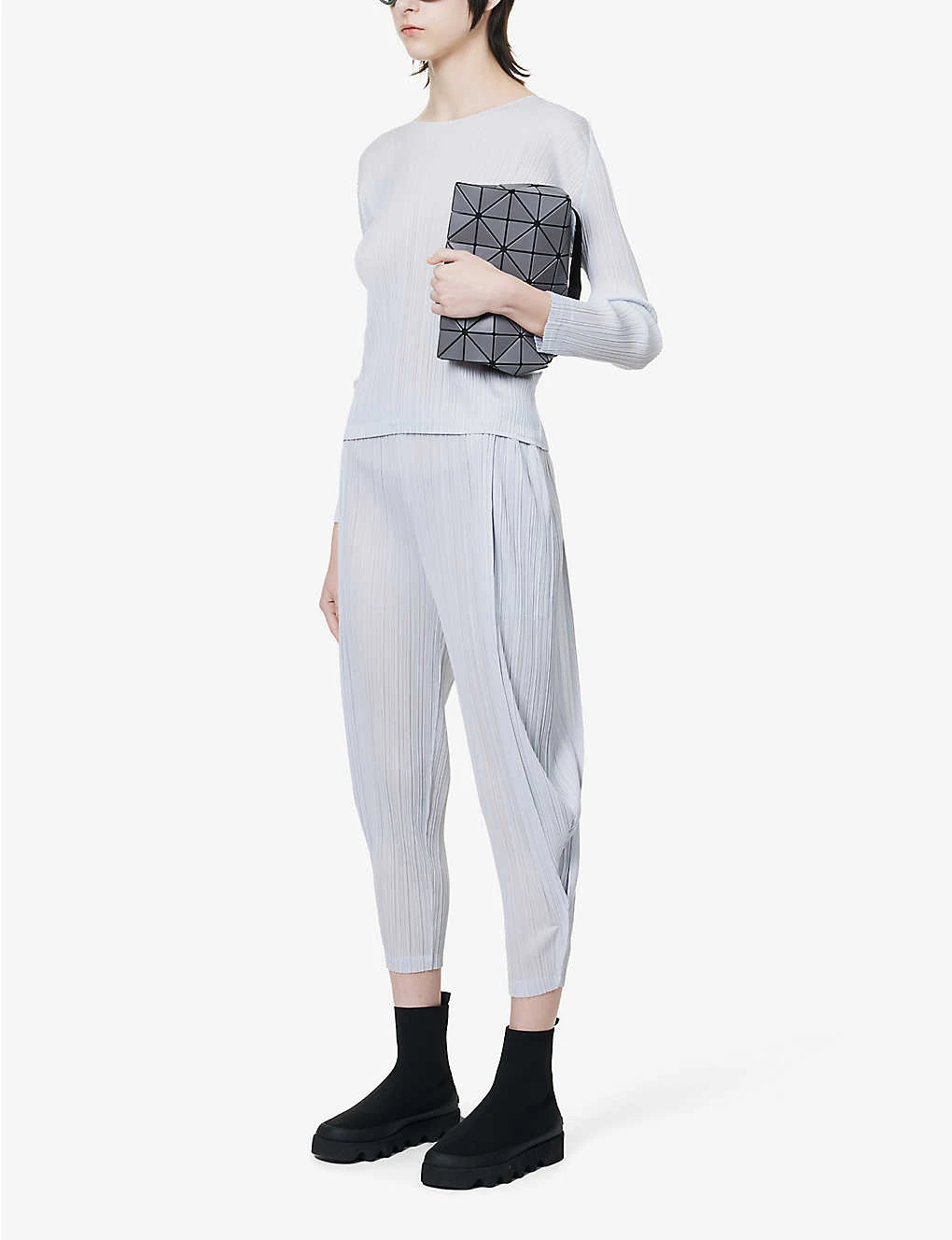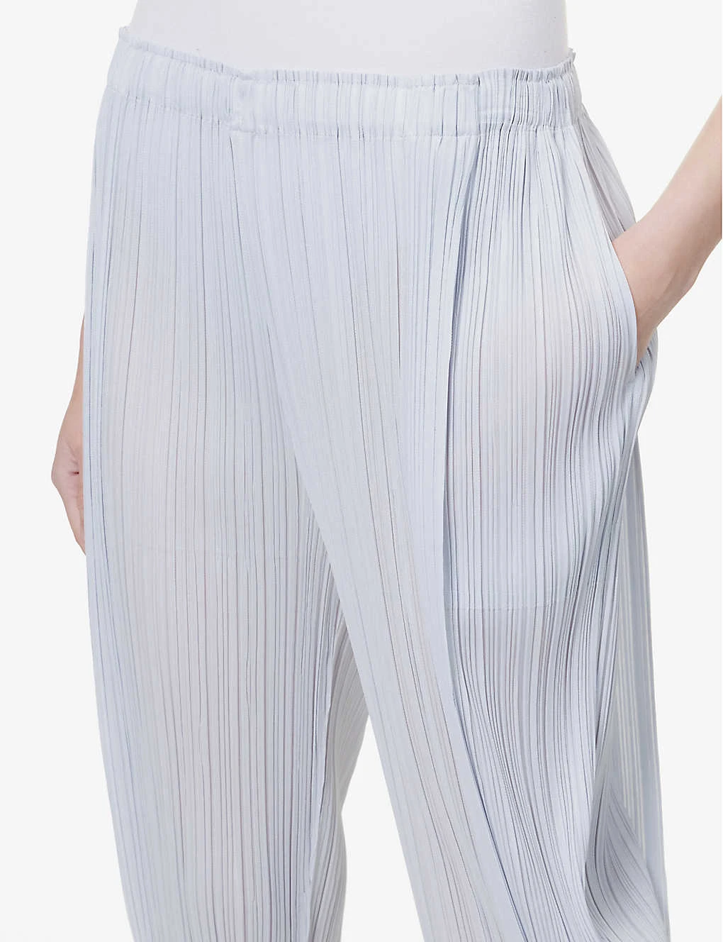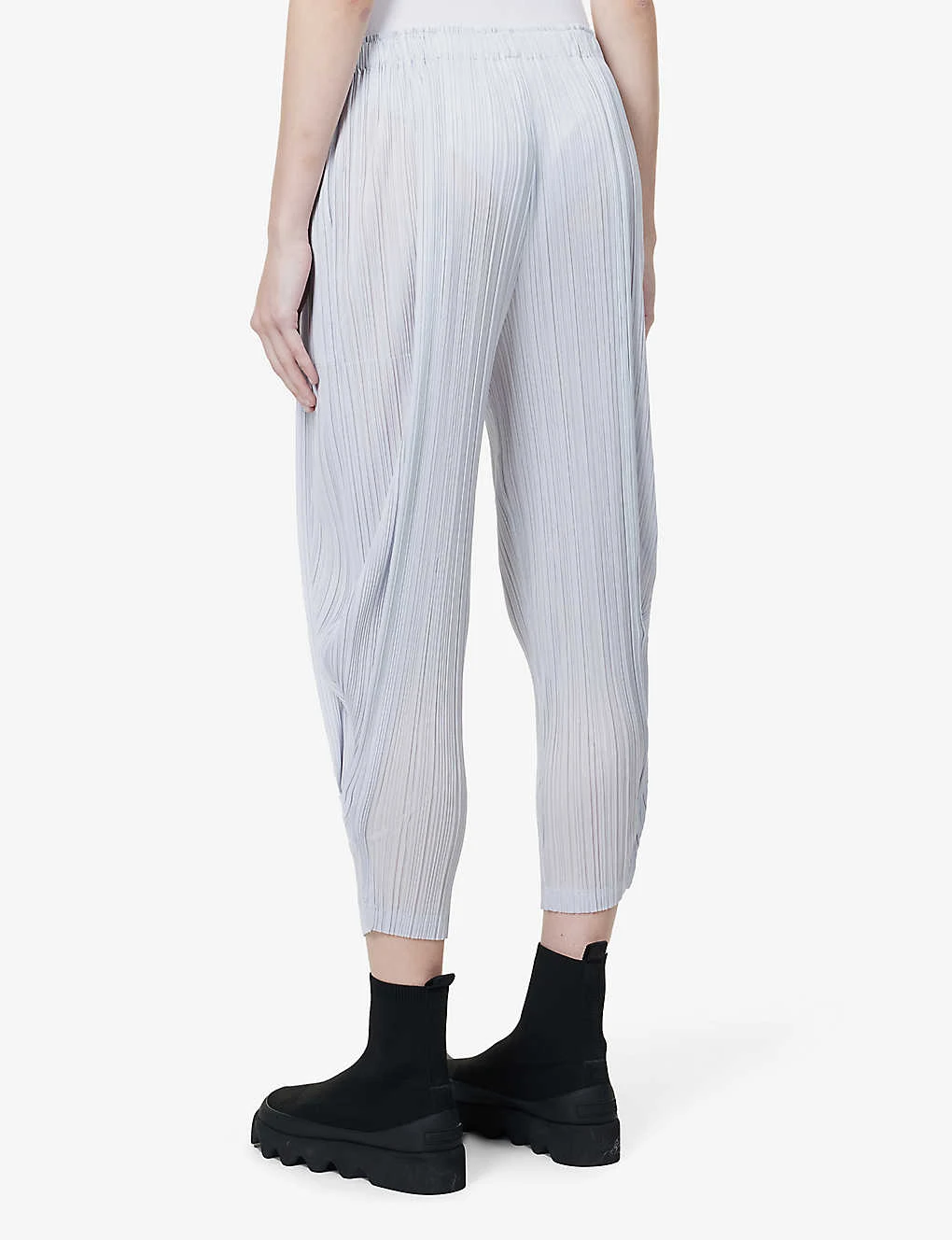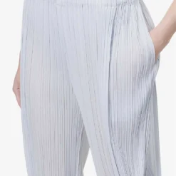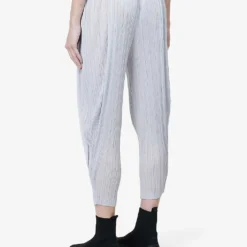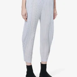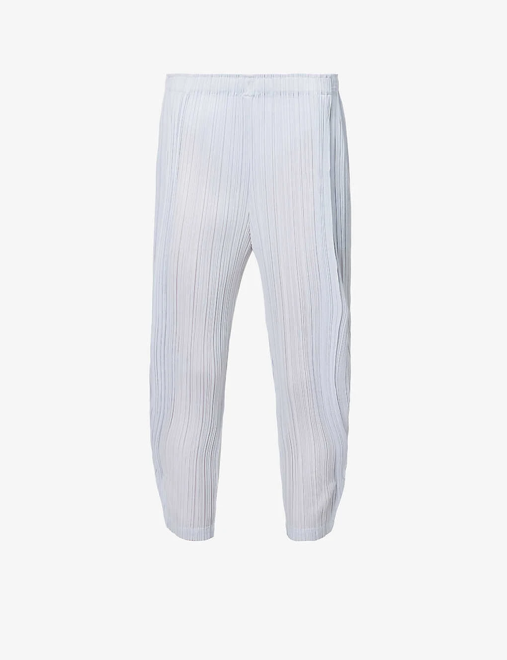 - Regular fit, mid-rise, wide tapered leg, structured elasticated waistband, two slip pockets at front, all-over textured pleats pattern