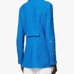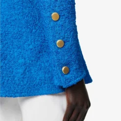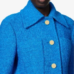- Regular-fit, round neck, long sleeves, four functioning buttons at cuffs, gold-toned hardware, darts at front, slip pocket at chest, two patch pockets at front, all-over bouclé weave,