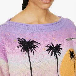 - Relaxed fit, boat neckline, long sleeves, brand embroidery at front, abstract knit pattern, medium knit texture, ribbed trims